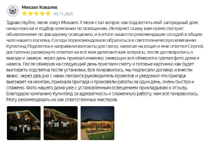 Здравствуйте, меня зовут Михаил. У меня стал вопрос как подсветить мой загородный дом, начал поиски и подбор компании по освещению. Интернет скажу вам прямо пестрит объявлениями по фасадному освещению, и в итоге нашел по рекомендации соседей в общем чате нашего поселка. Соседи порекомендовали обратиться в светотехническую компанию Купилэнд Подсветка и направили контакты для связи, написал на вацап и мне ответил Сергей Ковальских, достаточно развернуто ответил на все мои дилетантские вопросы, после договорились о выезде и замере, через день приехал инженер замерщик все обмерял и сделал фото дома и навеса. После обмеров на следующий день прислали смету и готовые картинки как будет выглядеть подсветка после установки. Все понравилось, мы подписали договор и внесли аванс, через два дня с нами связался руководитель проектов и уведомил что бригада выезжает на монтаж, приехала бригада и произвели работы за один день, очень быстро и слажено. Фото нашего дома уже с установленным освещением прикладываю к отзыву. Благодарю компанию Купилэнд за адекватность и слаженную работу, нам всё понравилось. Могу рекомендовать их как ответственных мастеров.
