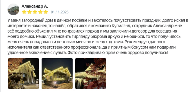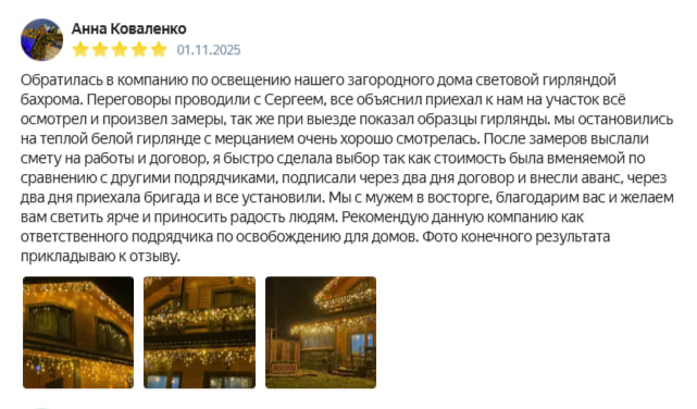 Обратилась в компанию КУПИЛЭНД_Подсветка по освещению нашего загородного дома световой гирляндой бахрома. Переговоры проводили с Сергеем, все объяснил приехал к нам на участок всё осмотрел и произвел замеры, так же при выезде показал образцы гирлянды. мы остановились на теплой белой гирлянде с мерцанием очень хорошо смотрелась. После замеров выслали смету на работы и договор, я быстро сделала выбор так как стоимость была вменяемой по сравнению с другими подрядчиками, подписали через два дня договор и внесли аванс, через два дня приехала бригада и все установили. Мы с мужем в восторге, благодарим вас и желаем вам светить ярче и приносить радость людям. Рекомендую данную компанию как ответственного подрядчика по освещению домов уличными гирляндами для домов. Фото конечного результата прикладываю к отзыву.