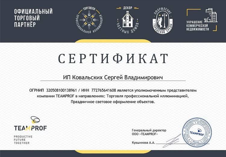 Подтверждаю, что Сергей Владимирович Ковальских является официальным торговым представителем нашей компании ТEAMPROF в направлении: Торговля профессиональной диодной светотехникой. Праздничное световое оформление объектов недвижимости и территорий в городе Москва и Московская Область.